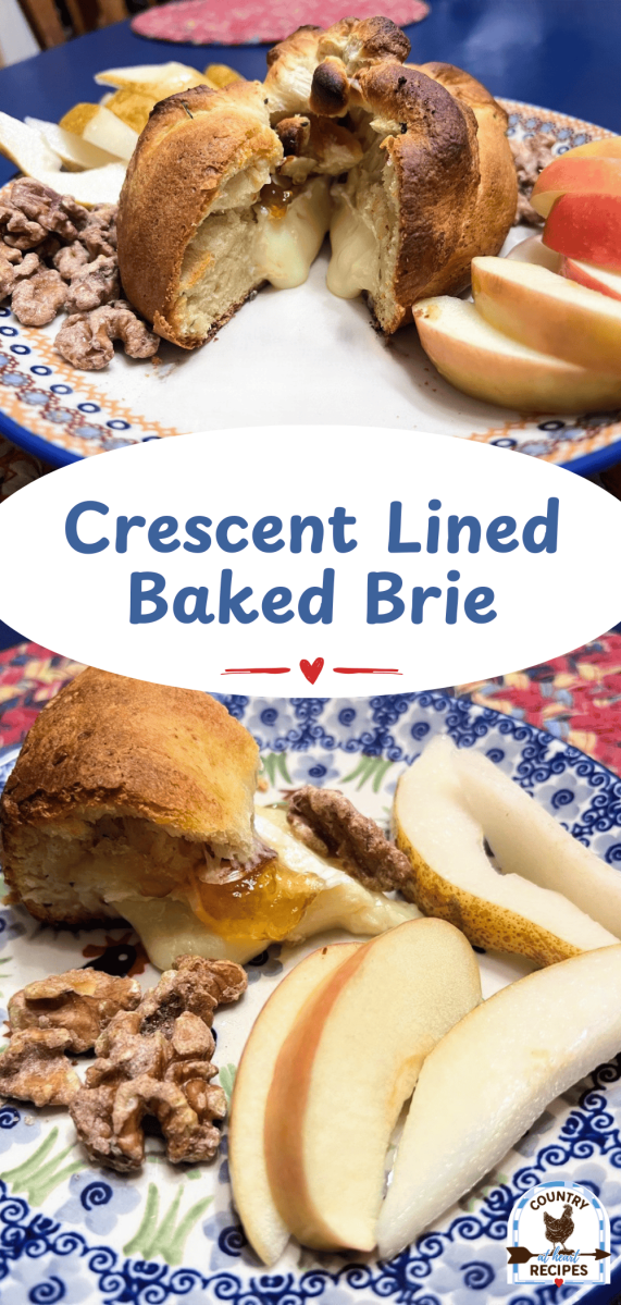 You’ll want to serve Crescent Lined Baked Brie shortly after removing from the oven to ensure that the brie will ooze. Transfer to a pretty serving platter. Serve warm with crackers, sliced apples or pears, and English walnuts. My Glazed English Walnuts pair splendidly with the brie and apricot flavors.