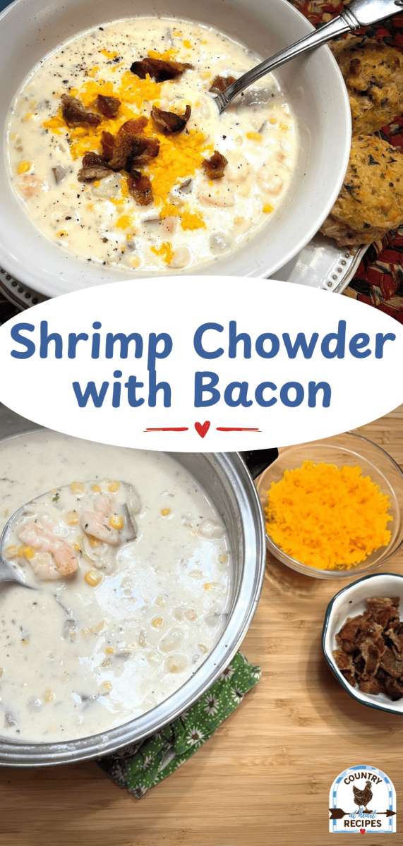 Shrimp Chowder with Bacon is a recipe my husband and I both enjoy. I love the creamy sweetness, the chunky pieces of shrimp, all topped with cheddar cheese, and crisp chewy bacon. Serve this with a slice of hard, crusty bread. So yummy!
