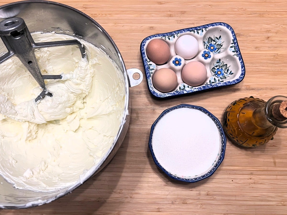- In a large mixing bowl, beat the softened 24 oz cream cheese until smooth. Mix in 1 cup granulated sugar, and then add 4 large eggs one at a time, mixing well between additions. Stir in 2 teaspoons vanilla extract.