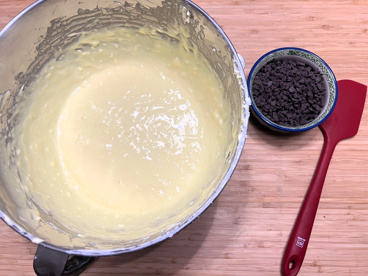 - Finish by folding in 1 cup miniature semisweet chocolate chips until incorporated.