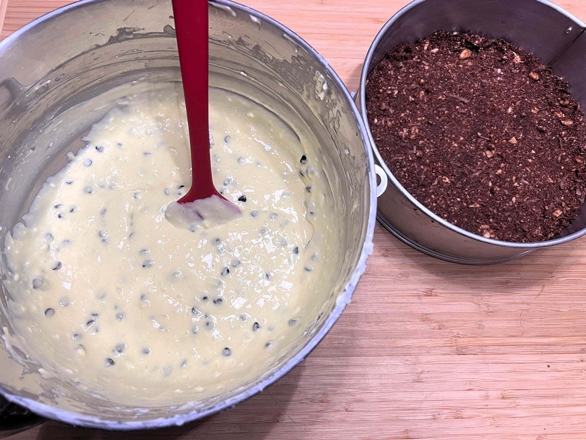 - Pour the batter into prepared crust, carefully spreading the cream cheese mixture to the edges and leveling it with a rubber spatula. Try not to touch the edges of the pan, which will cause sticking when baked.