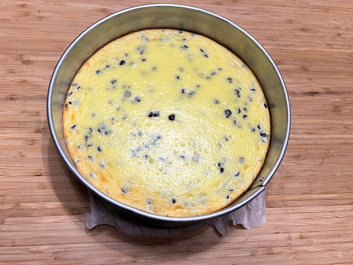 Pour the batter into prepared crust, carefully spreading the cream cheese mixture to the edges and leveling it with a rubber spatula. Try not to touch the edges of the pan, which will cause excess sticking when baked.