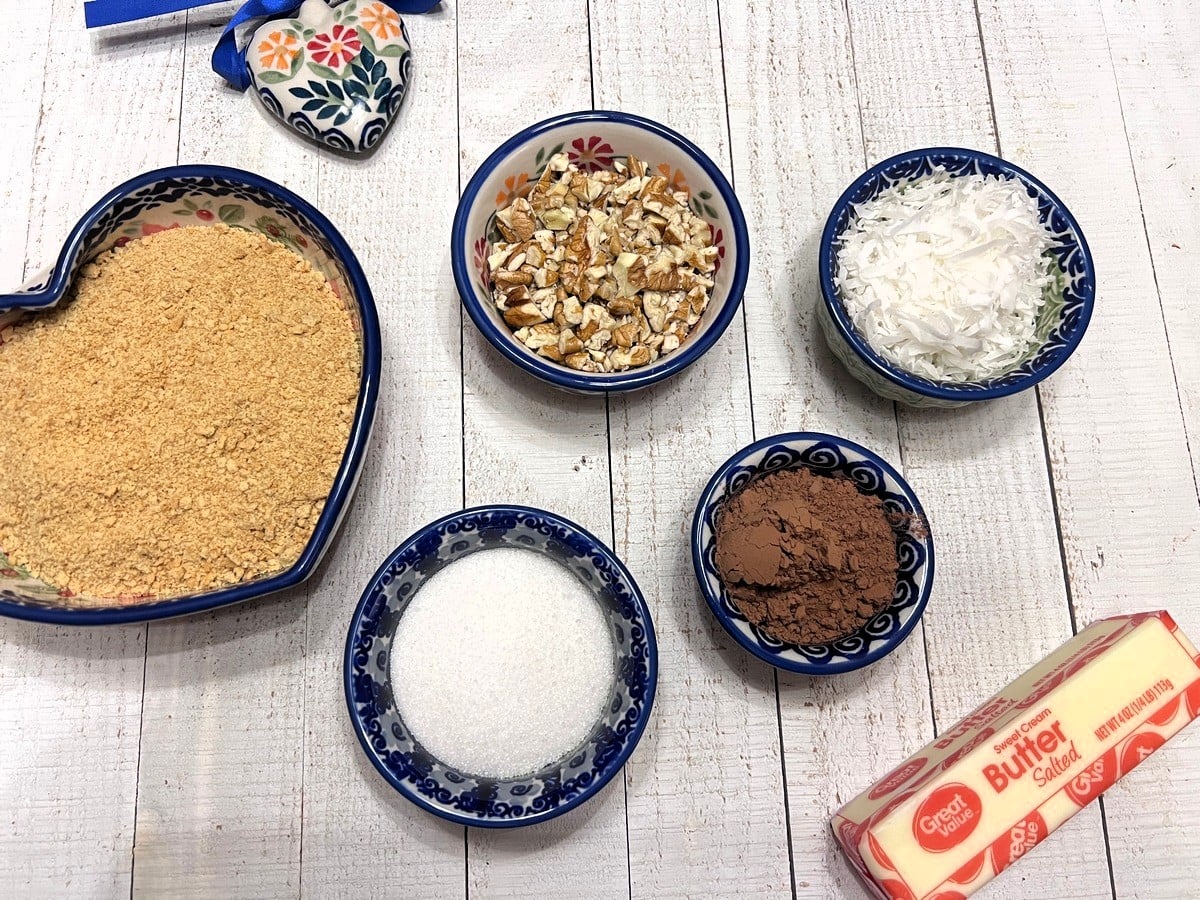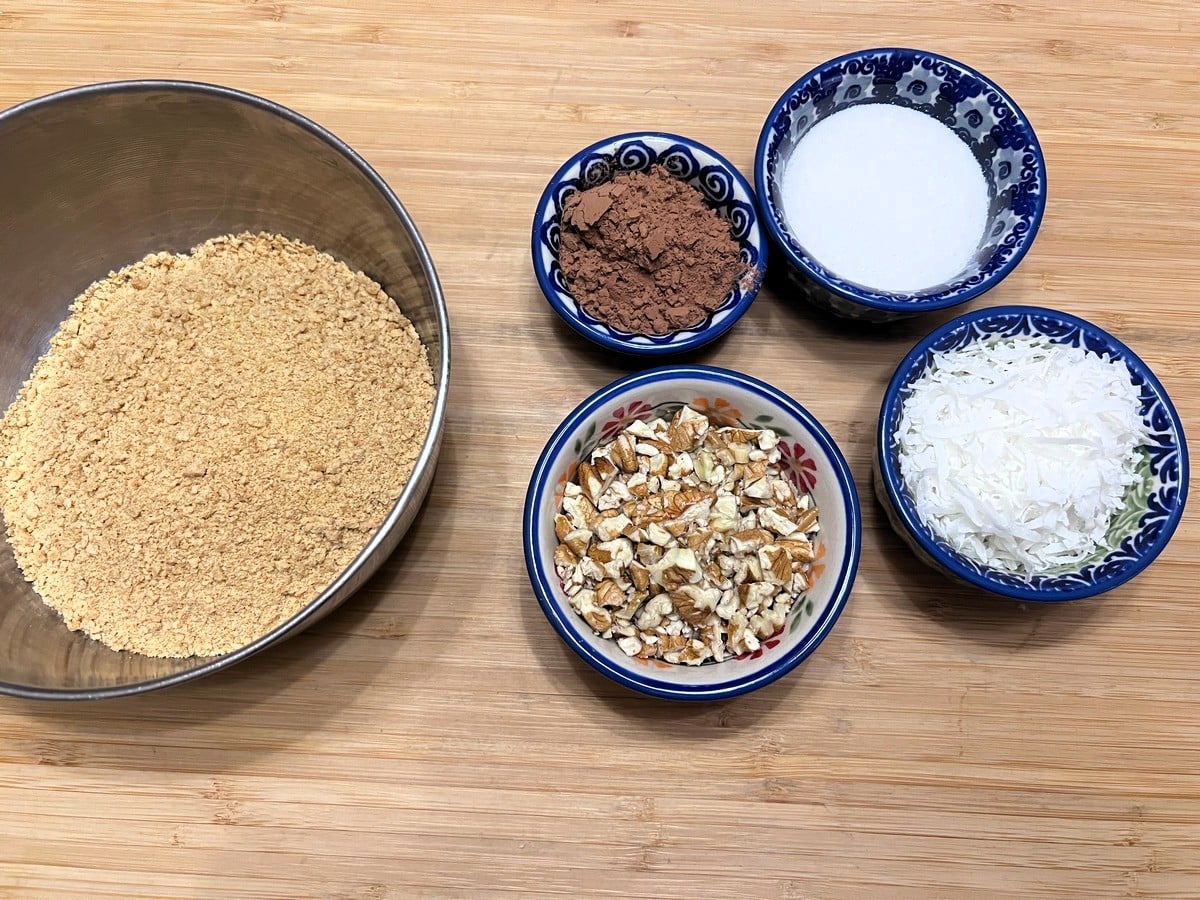 - In a medium mixing bowl, combine vanilla wafer crumbs, 1/3 cup flaked coconut, 1/4 cup granulated sugar, and 3 tablespoons baking cocoa. Add to this 1/3 cup butter (melted) and mix well.
