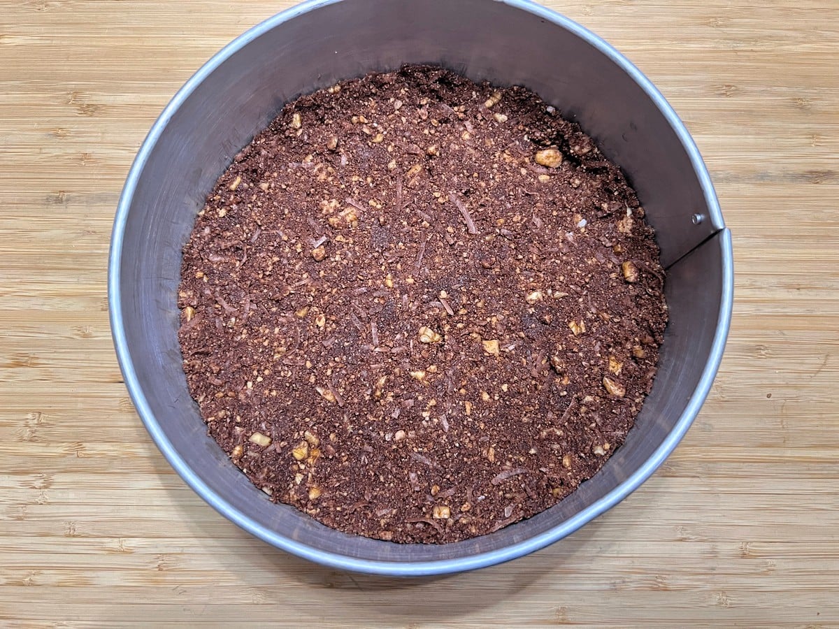 - Press the crust onto the bottom of a 9-inch springform pan. Set aside.