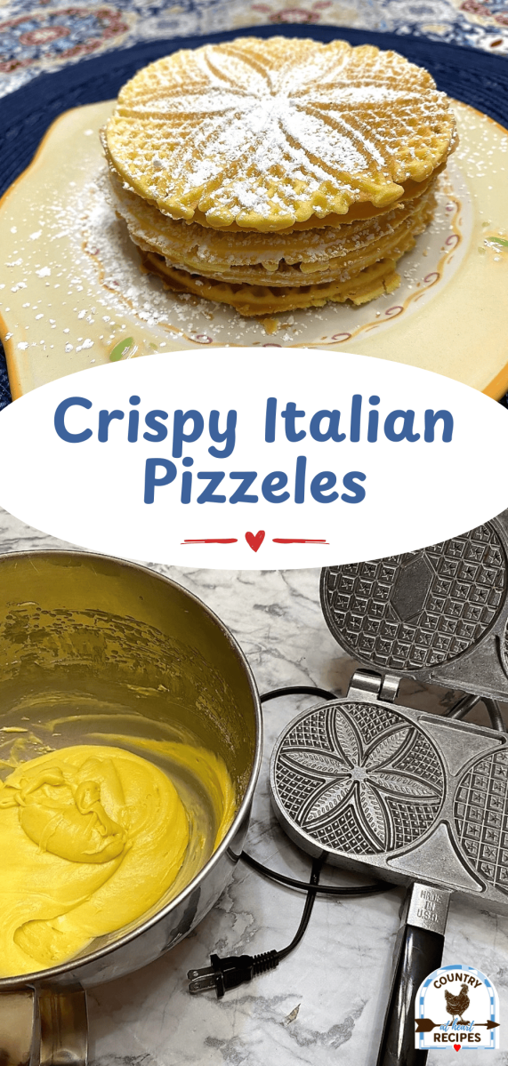 What are Pizzelles? Pizzelle comes from the Italian word ‘Pizze’ which means round and flat. And “elle”, which means small. These small, round, and flat sugar cookies are made with a special iron that gives them a pretty design. Kind of like a waffle maker, only thinner. Then they are often finished off with a sprinkling of powdered sugar.