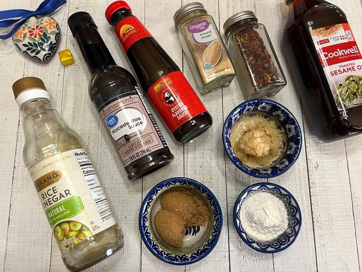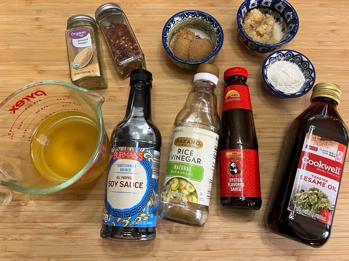 - In a small bowl whisk together 1 cup (2.37 dl) chicken broth, 1/3 cup (78.86 ml) soy sauce, 3 tablespoons (44.36 ml) oyster sauce, 2 tablespoons (29.57 ml) rice vinegar, 2 tablespoons (29.57 ml) brown sugar, 2 tablespoons (29.57 ml) cornstarch, 2 teaspoons (9.86 ml) sesame oil, 1/2 teaspoon (2.46 ml) ground ginger, 1/2 teaspoon (2.46 ml) freshly ground black pepper, and 1/4 teaspoon (1.23 ml) red pepper flakes. Set aside.