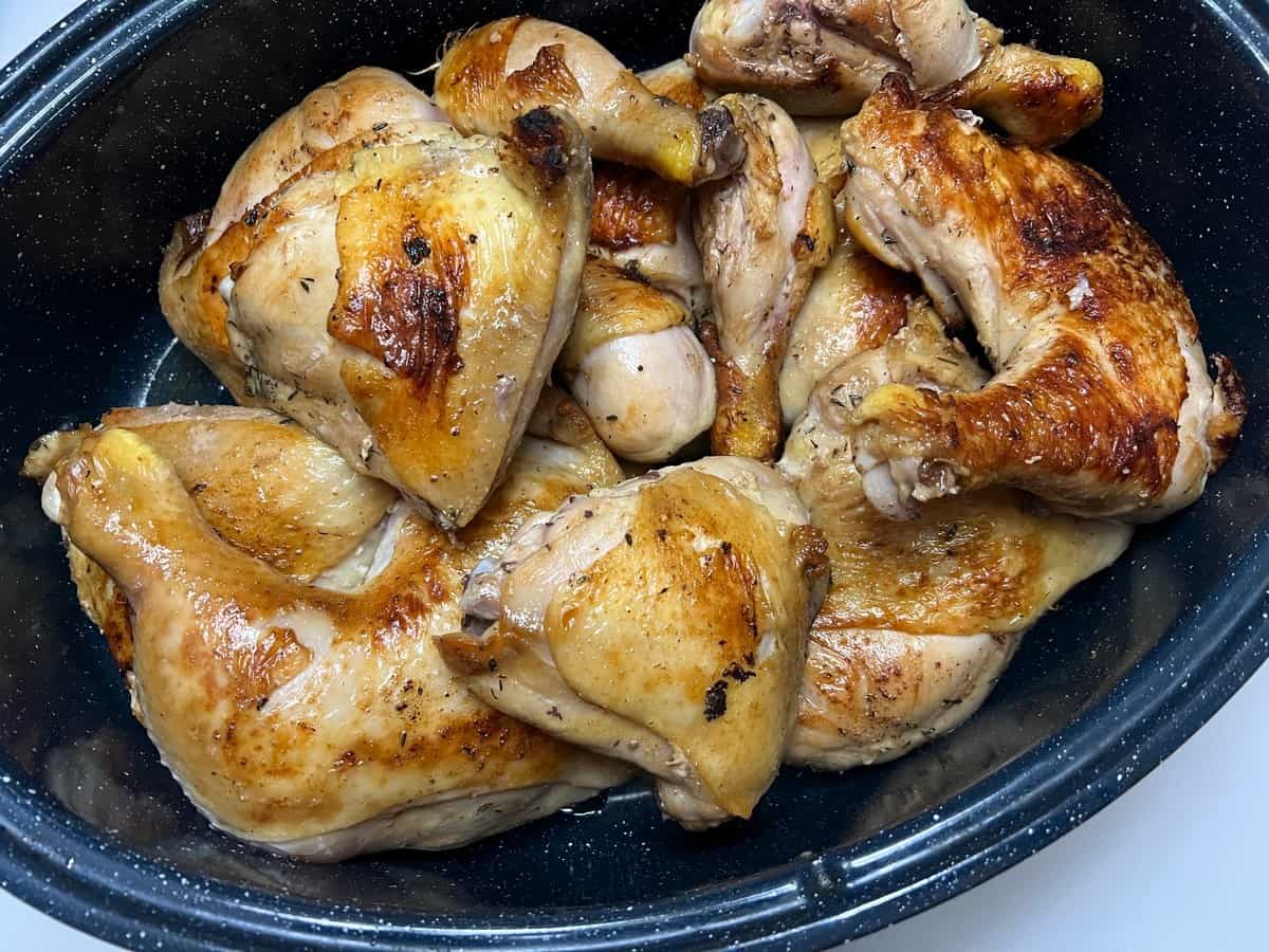 Another option is to place the roasted chicken pieces on a bed of rice or dressing with the root vegetables in a separate bowl or platter. You may also opt to slice a few of the chicken legs from the thighs for those who may not want an entire leg quarter. Garnish with fresh parsley and if desired, pomegranate arils.