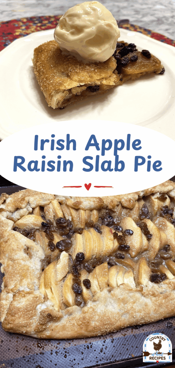 This recipe for Irish Apple-Raisin Slab Pie is one our family loves. Filled with tart apples, sweet raisins, and a healthy dose of Irish Cream sauce nestled inside a rustic pastry crust. It’s so good. Add a scoop of vanilla ice cream and it becomes even better. A perfect dessert to celebrate the Irish, especially if you have a liking for Irish Cream.