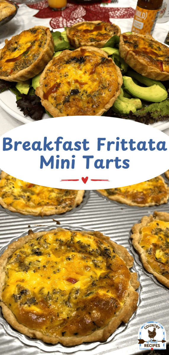 Breakfast Frittata Mini Tarts are a great addition to a special brunch or holiday table. Individual tart shells with vegetables, cheese, and egg filling. Place them on a bed of spring salad with avocados and drizzle with your favorite hot sauce. So yummy!