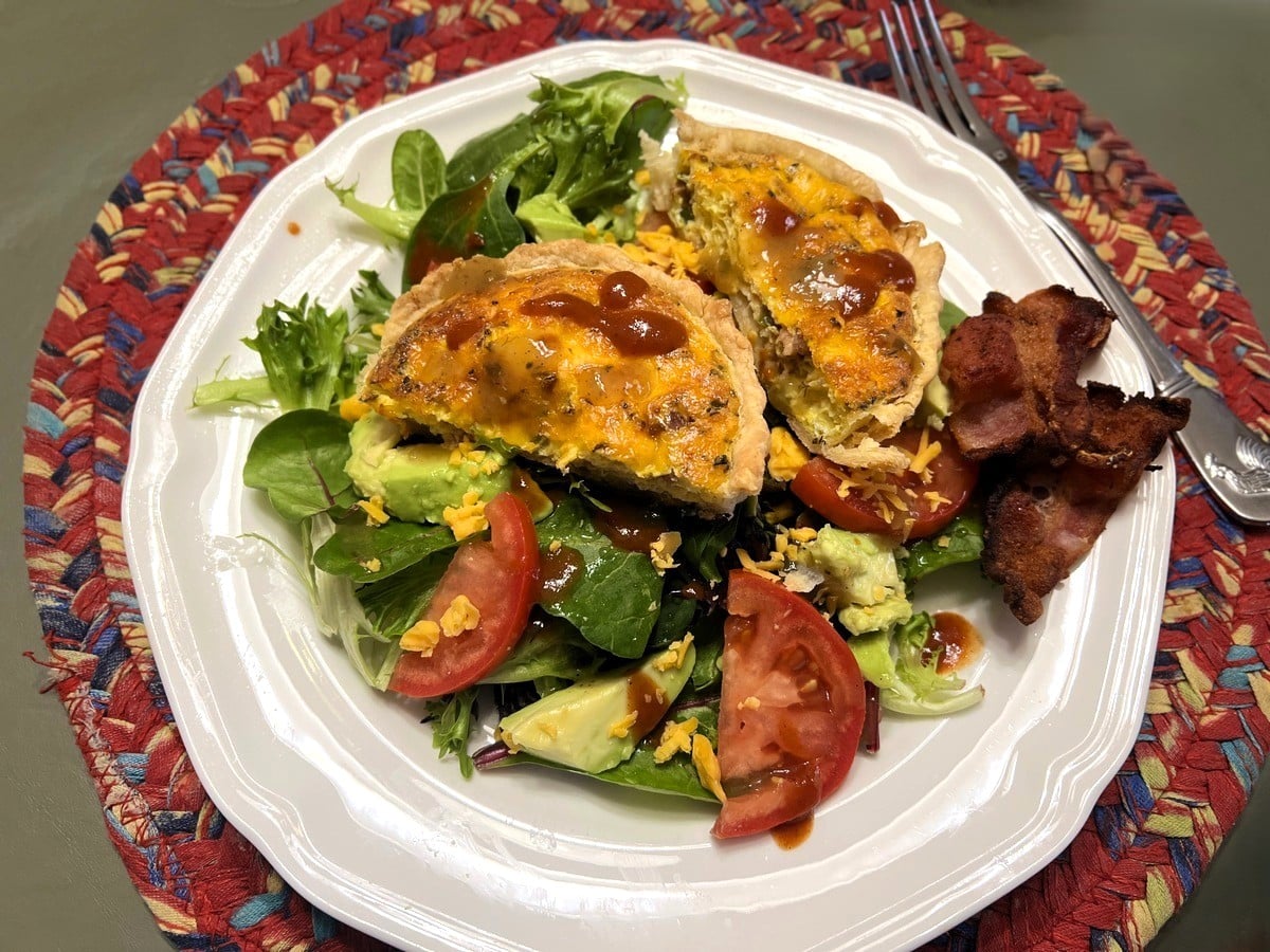 I made these mini tarts (or tartlets) for a Christmas brunch and our family enjoyed them immensely. They are bright and colorful on the table, and so delicious, especially when served with green salad mix and avocados. I love to drizzle the tarts with a red and green hot sauce, which is perfect for a Christmas.