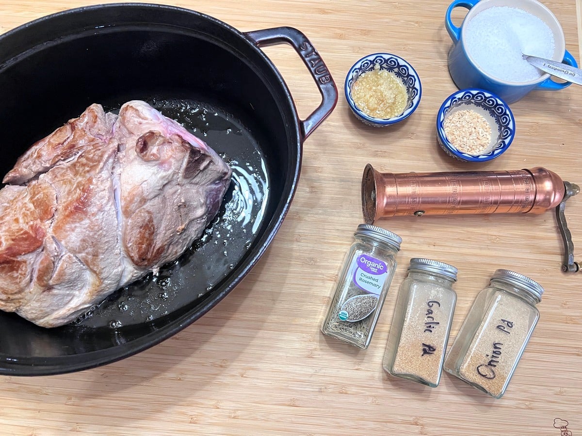 - Using a large Dutch oven, heat 2 tablespoons vegetable oil over medium heat. Brown all sides of the 4 pound Pork Butt Roast Once browned, season with 1 tablespoon minced garlic, 1 tablespoon dried minced onion, 2 teaspoons crushed rosemary, 1 teaspoon garlic powder, 1 teaspoon onion powder1 teaspoon kosher salt, and 1/2 teaspoon freshly ground black pepper. Pour prepared beef broth over the roast.