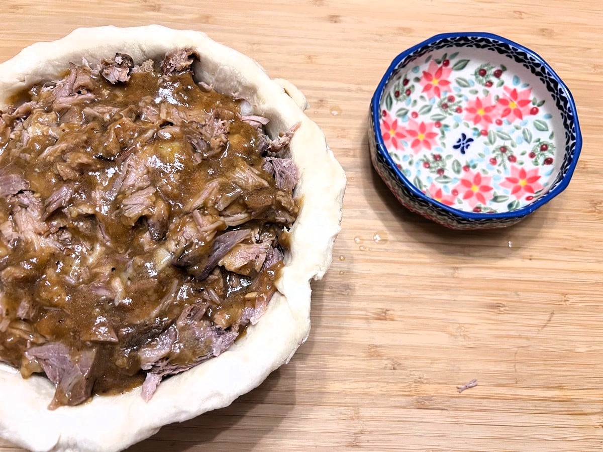 Pour prepared brown gravy over the pork, allowing it to sink in to the bottom. You may add between 1/2 – 2/3 cups of gravy to the pie.