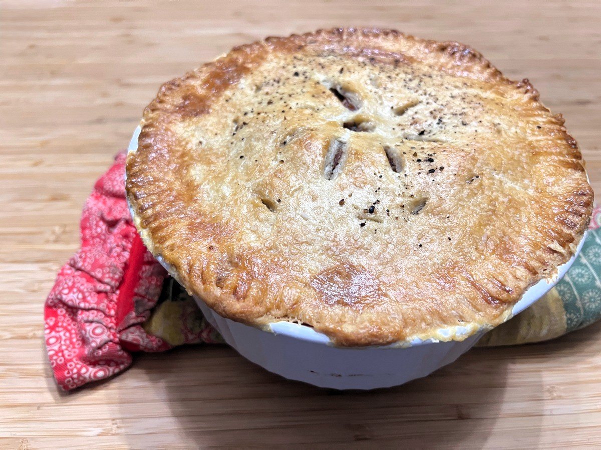 Divide dough into 2 pieces to fit a 32 oz Ramakin, with the top using 1/3 of the dough, and the bottom 2/3. With a rolling pin, roll the bottom dough out on a lightly floured surface, large enough to fit the bottom and sides of the baking dish. Roll the top to fit the top of the dish. Using kitchen shears, snip design in the top crust to allow steam to escape while baking.