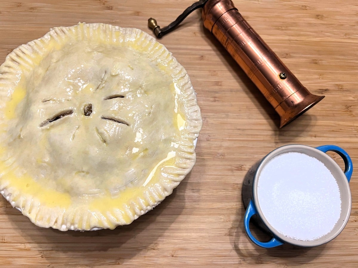 - Next, prepare an egg wash by whisking together 1 large egg + 2 tablespoons water. Generously brush the egg wash over the top of the pie to give it a beautiful golden brown crust once it’s baked. Sprinkle the top with 1/2 teaspoon kosher salt and 1/2 teaspoon freshly ground black pepper.
