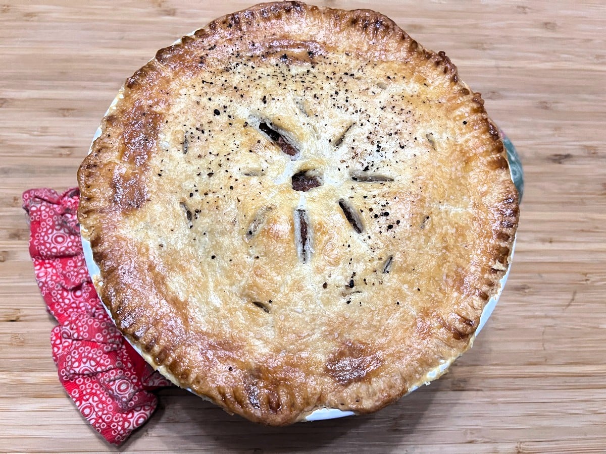 When studying English Pork Pies, I found that most recipes called for a “hot water crust”, which is different from pie pastry and is supposed to provide a sturdier crust to hold the meat filling. Wanting to test this theory, I used my own pie crust recipe with vegetable shortening, and it worked just fine. Note the photo above which shows that the pie can indeed stand on its own, solid and sturdy. I’ve made the recipe enough times to be sure of this.