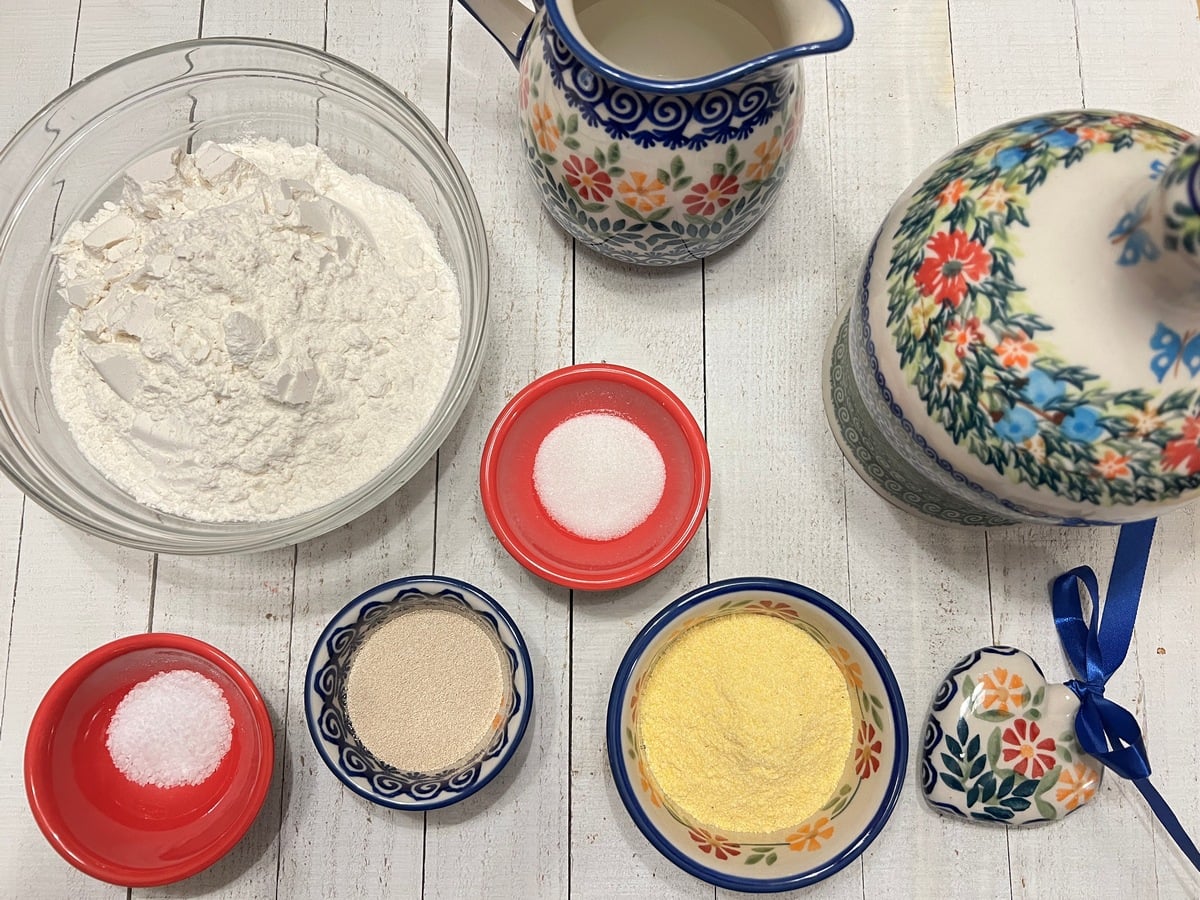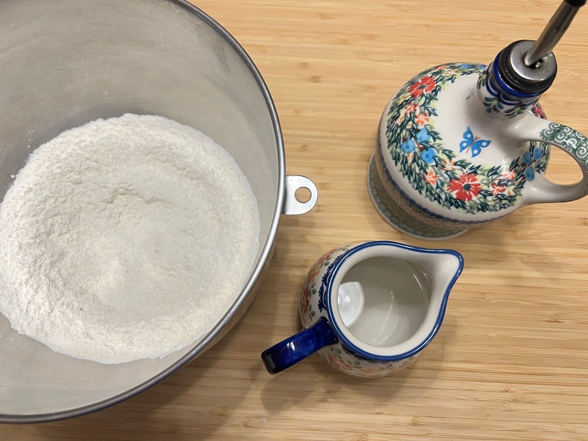 For each step below, gather the ingredients so you have everything close at hand on the counter or table. First you’ll need the dough ingredients.