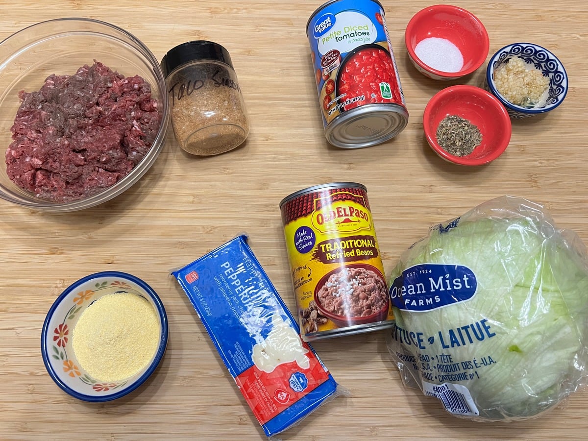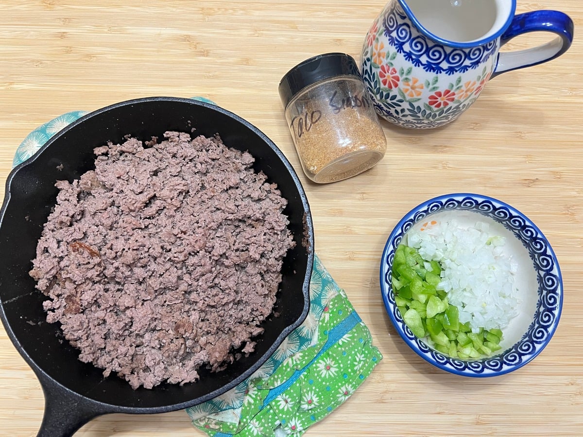 - In a small skillet, brown 1/2 pound (226.8 g) lean ground beef or ground venison over medium high heat. Add the diced sweet onion and green bell pepper to the meat and allow to cook until tender. Season the ground beef with 2 teaspoons (9.86 ml) taco seasoning, and 1/3 cup (78.86 ml) water. Simmer on low until the water is nearly gone, about 12-15 minutes.