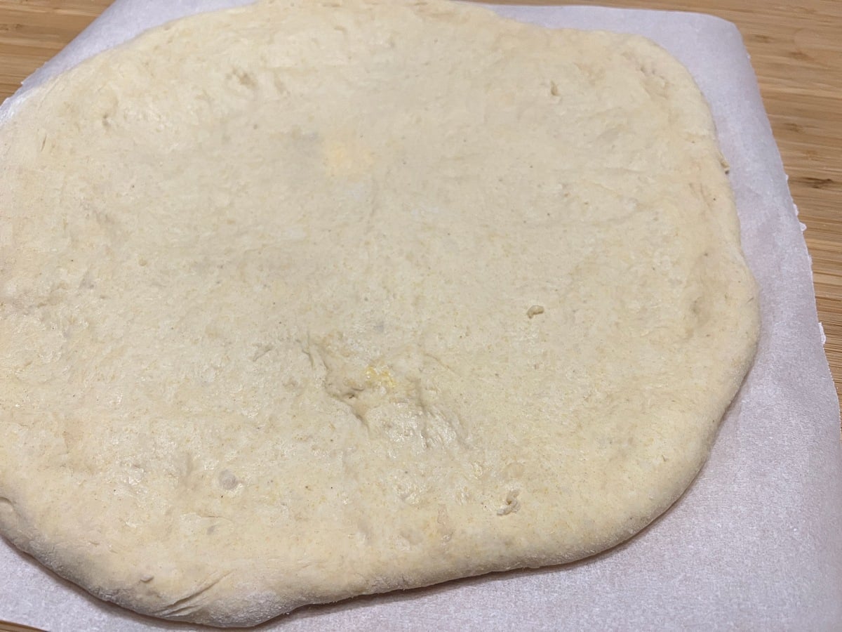 - Using a rolling pin or your fingers, press the dough into a circle, approximately 15″. Place the dough on the parchment paper and continue pressing the dough to fit, being careful not to touch the outer edges of the dough.