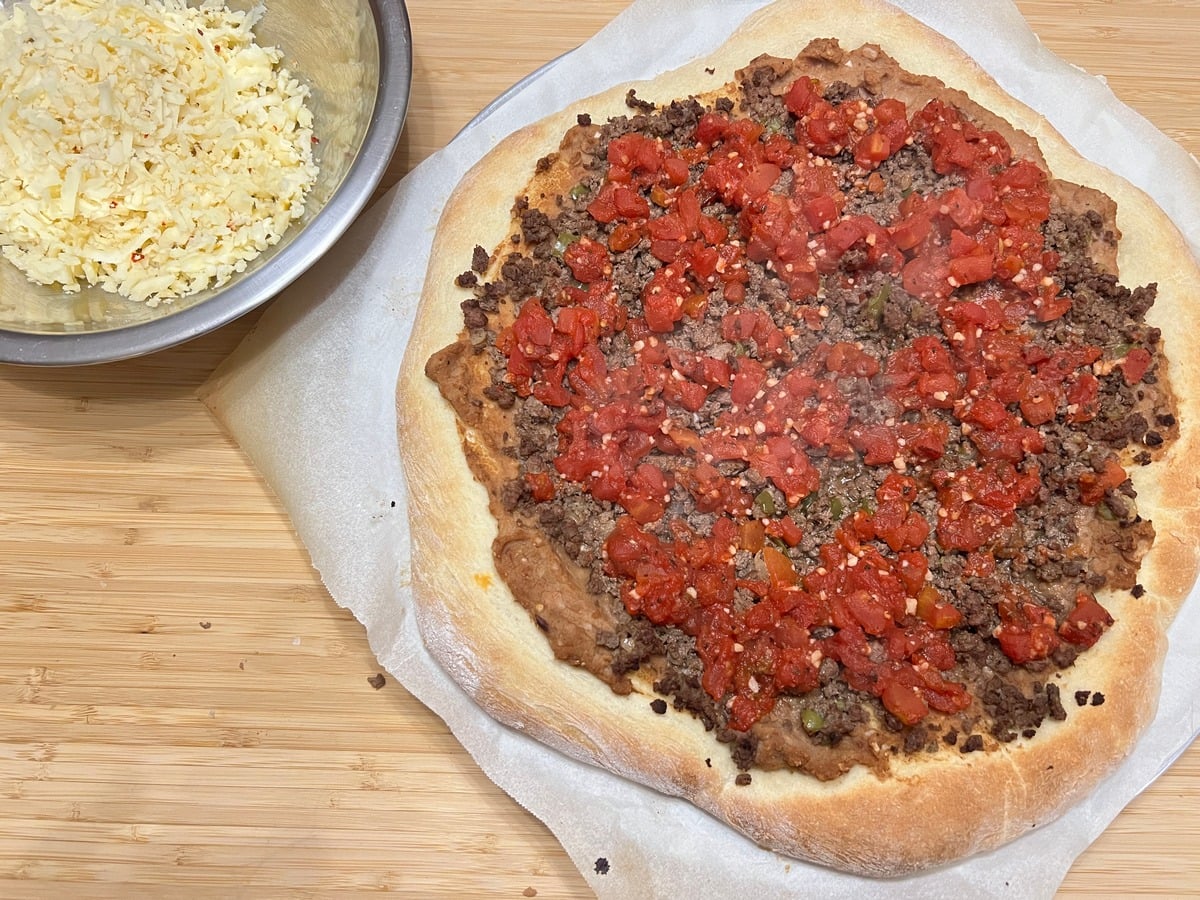 Next, begin assembling the pizza by brushing 1-2 tablespoons of extra virgin olive oil over the top of the crust, followed by the refried beans. Spread the beans to within 1″ of the edges. After that, spoon the browned meat mixture over the beans, and then the pizza sauce. For even more toppings, you may add optional sliced jalapenos and/or sliced ripe olives, if desired.