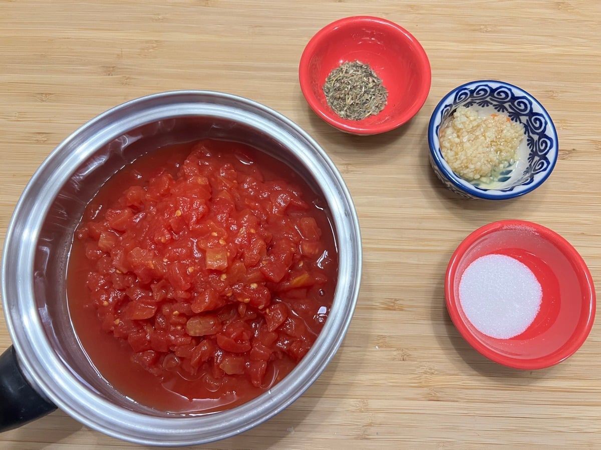 - Preheat oven to 425°F along with a baking stone on the next to lowest rack. In a small saucepan, mix together 15.5 oz (439.42 g) petite diced tomatoes or crushed tomatoes, 1 tablespoons (14.79 ml) minced garlic, 2 teaspoons (9.86 ml) granulated sugar, 1 teaspoon (4.93 ml) Italian seasoning, 1/2 teaspoon (2.46 ml) kosher salt, and 1/2 teaspoon (2.46 ml) freshly ground black pepper.