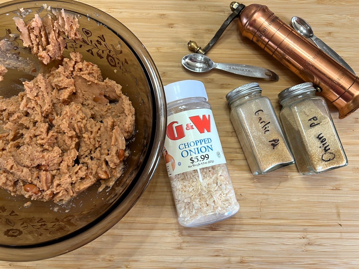 - Place 15.5 oz (439.42 g) refried beans in a large microwave safe bowl. Stir in 1 tablespoon (14.79 ml) dried minced onion, 1/2 teaspoon (2.46 ml) freshly ground black pepper, 1/4 teaspoon (1.23 ml) garlic powder, and 1/4 teaspoon (1.23 ml) onion powder. Mix well. Heat in microwave for about 3-4 minutes until warmed through.